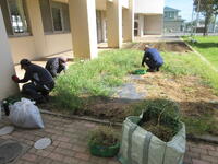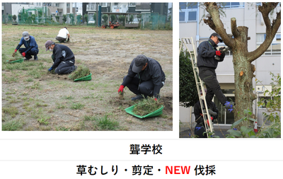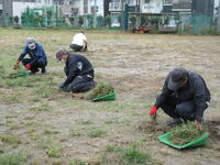 校庭の芝生化事業を受け、子供たちの安全・快適のため、芝生の管理・肥料撒きを行っています。