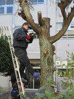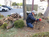 今回は剪定して出た枝の片付け作業を合同で行う予定が、急遽ヒマラヤスギの伐採作業になり、