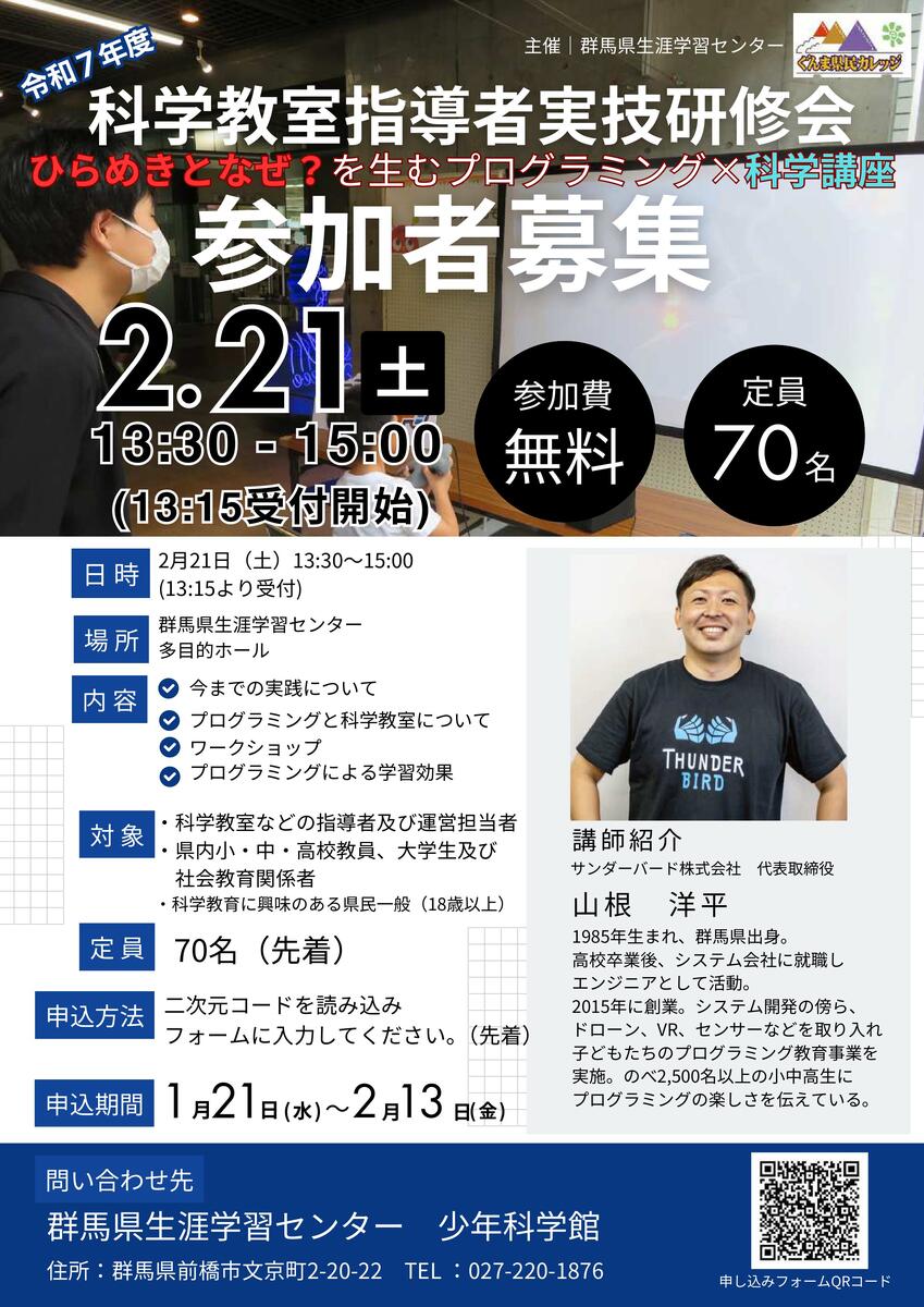 2月21日(土)の令和7年度科学教室指導者実技研修会の参加申込を1月21日(火)から開始します。申込フォームはこちらから。(1月20日)チラシのダウンロードはこちら。