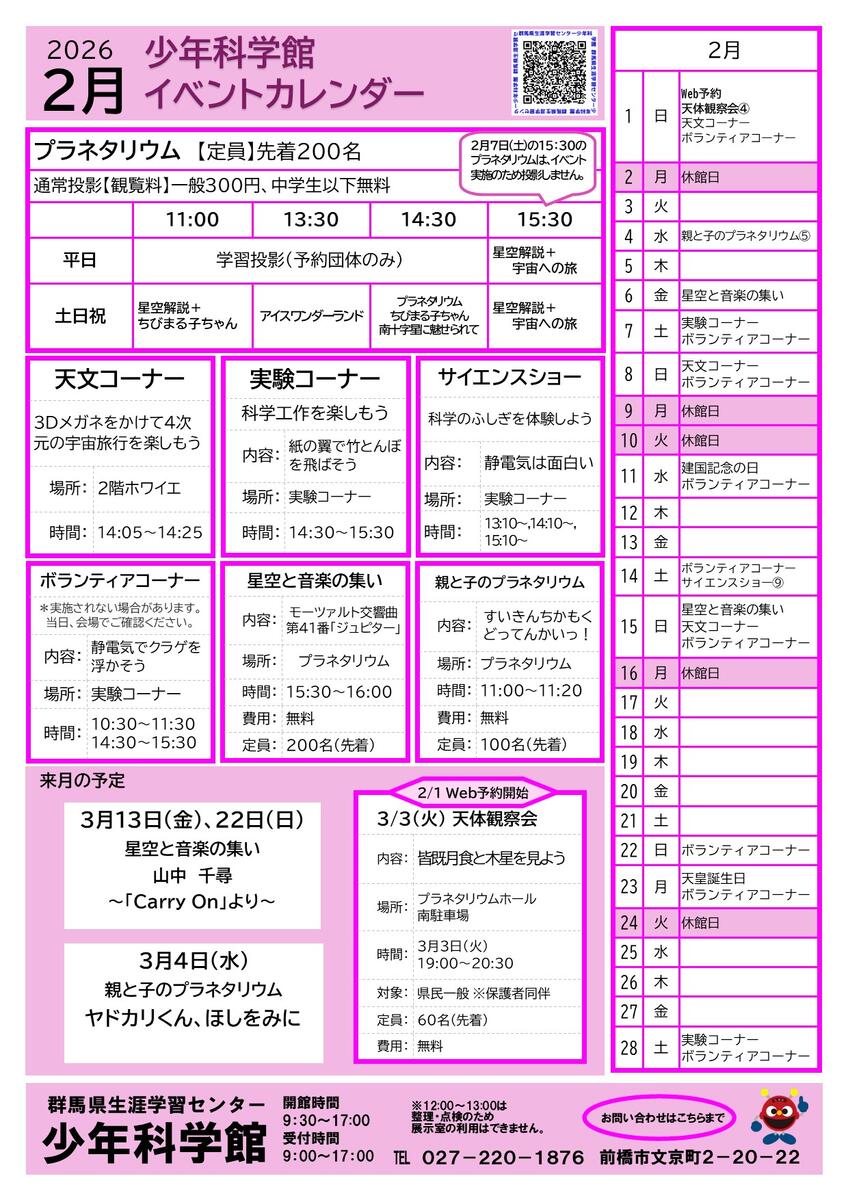 少年科学館(問い合せ受付時間 9:00~17:00)TEL 027-220-1876 FAX 027-221-5000 |